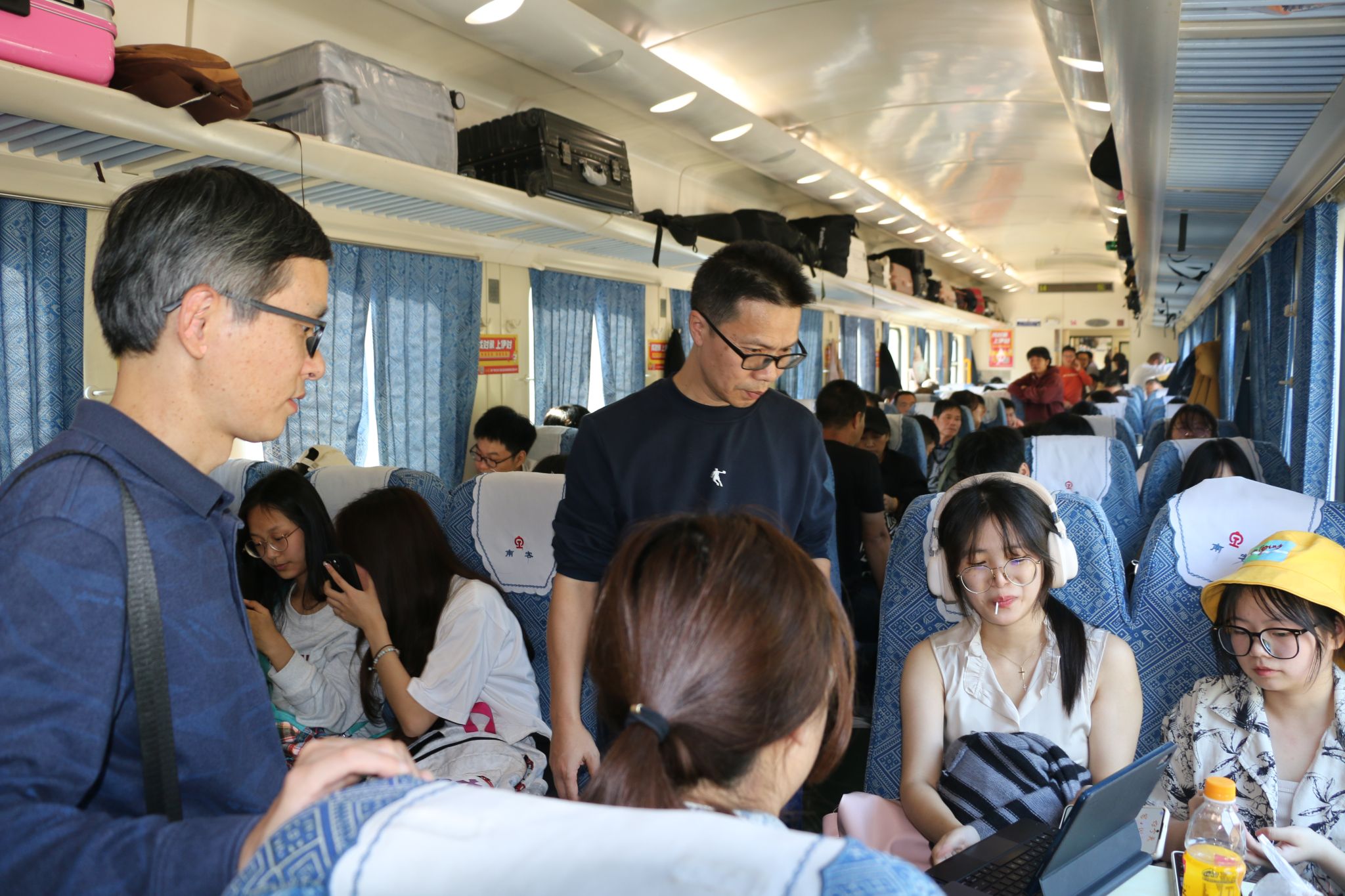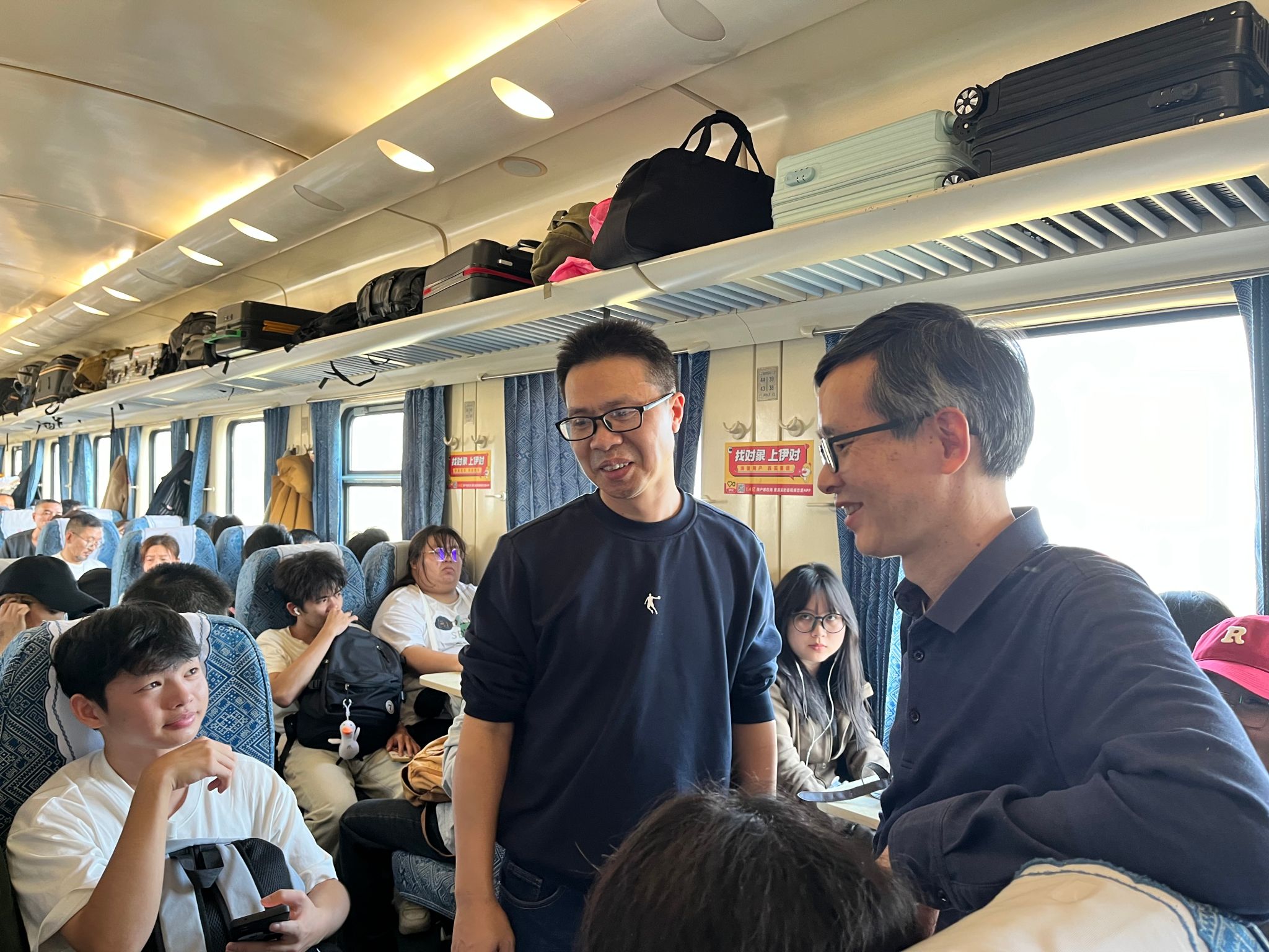 火车上,二十余人欢声笑语,是独属于年轻人的车厢。