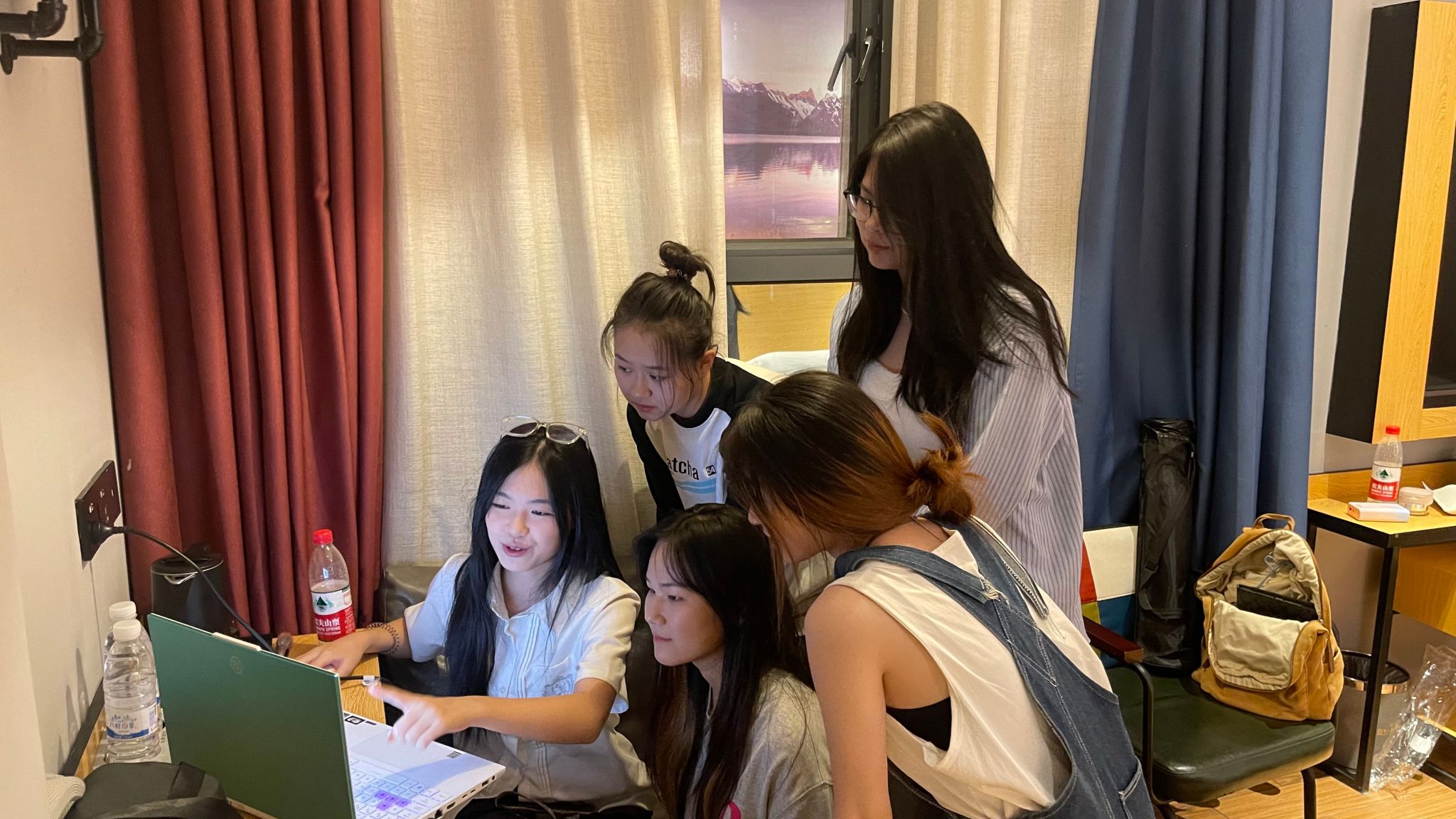 火车上,同学们对即将到来的外出实践充满了期待,老师们来到车厢里对同学们的见习作品策划进行指导要求,同学们对拍摄计划进行完善、整合,不停翻找着手机中的资料,当然,在网差的火车上一直看电子屏幕的后果就是——成功的晕车了......