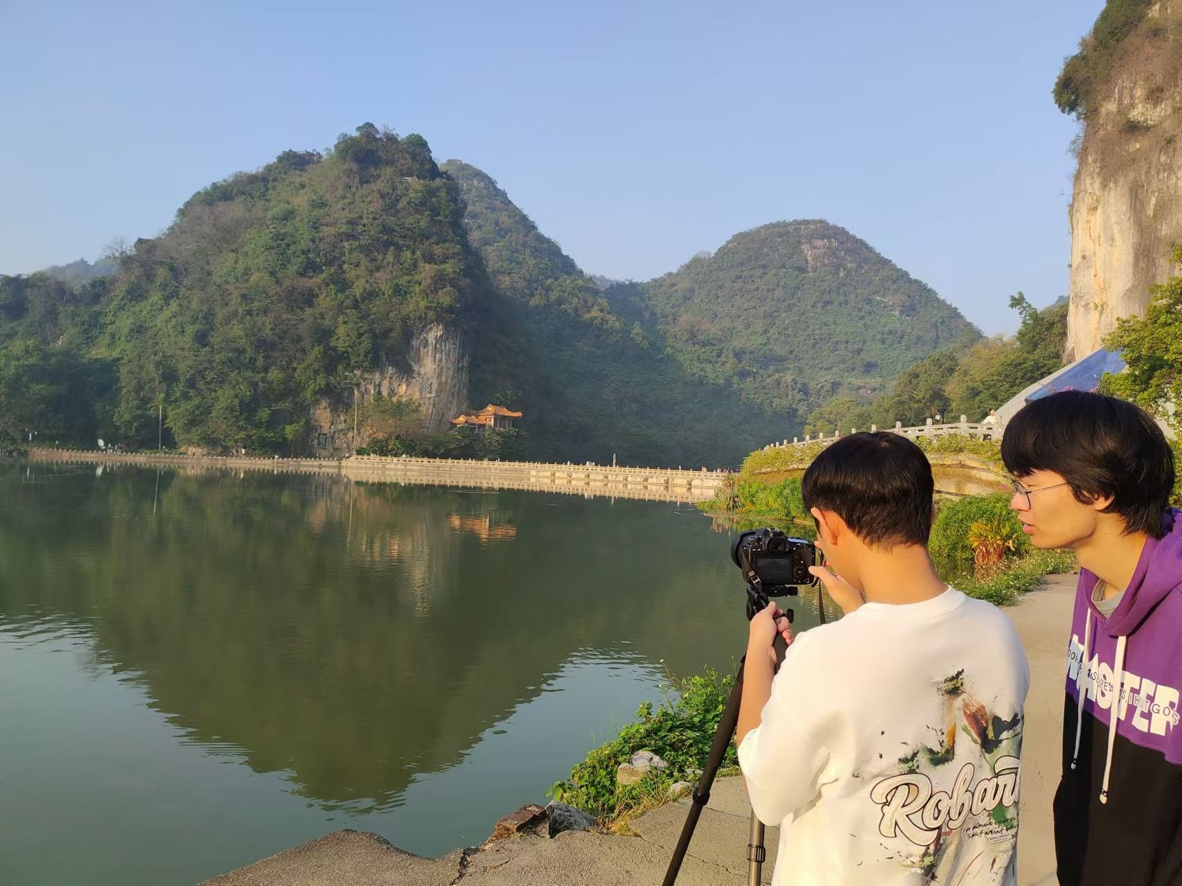 听见柳州小组选择了鱼峰公园、龙潭公园和西来古寺作为拍摄地点。他们记录了唱山歌的阿姐和阿叔对唱的悠扬歌声,捕捉了阿姐在林中的静谧画面。在龙潭公园,他们对自然风光进行了拍摄和声音采样,感受大自然的和谐与宁静。下午,他们走进西来古寺,拍摄了寺庙中的佛钟、香火和人们祈祷的画面,用镜头和声音共同描绘了一幅幅宁静祥和的寺庙画卷。