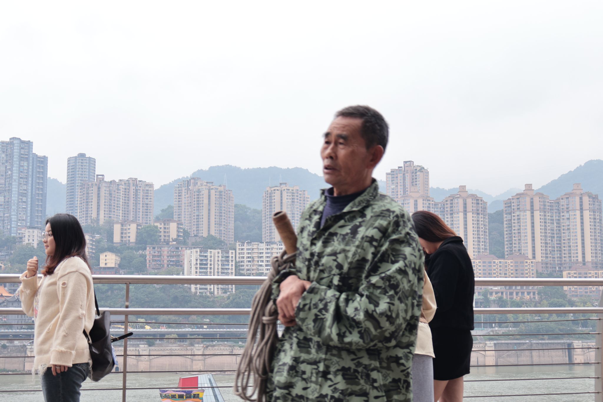 12日上午,两个见习小组来到了朝天门码头拍摄“山城棒棒军”。朝天门码头位于长江与嘉陵江两江交汇处,是重庆最大的水码头。江面船帆林立,舟楫穿梭,码头与繁华的商圈来福士相邻。山城以其独特的地理环境孕育出了这样一个特殊的行业,作为山城的符号名片,这些“棒棒”们爬坡上坎,四处揽客,靠着肩上一米长的竹竿,扛出了重庆特有的码头文化,也扛起了重庆的经济发展。