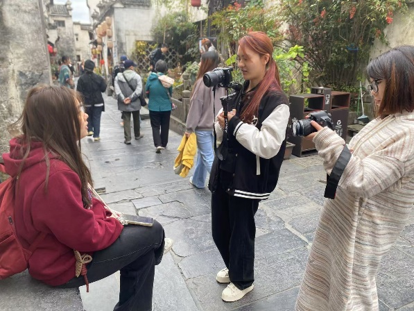 11月20日,2022级网新专业同学见习的第二天。第一天各组同学在老师的指导下对已定选题进行进一步的整理精进,在检验可行性后进行了初步拍摄。怀揣着对徽派古村落的热爱与探索之心,今天各个小组忙碌在各自选题上。穿梭在古徽州的西递,仿佛踏入了一幅动人心魄的水墨画卷。抬头望去,各种飞檐翘角的建筑交相呼应,构成了西递独特的风景线。阳光透过古老的马头墙,洒在青石板路上,映出斑驳的光影,仿佛给我们的见习之旅增添一抹神秘的色彩。