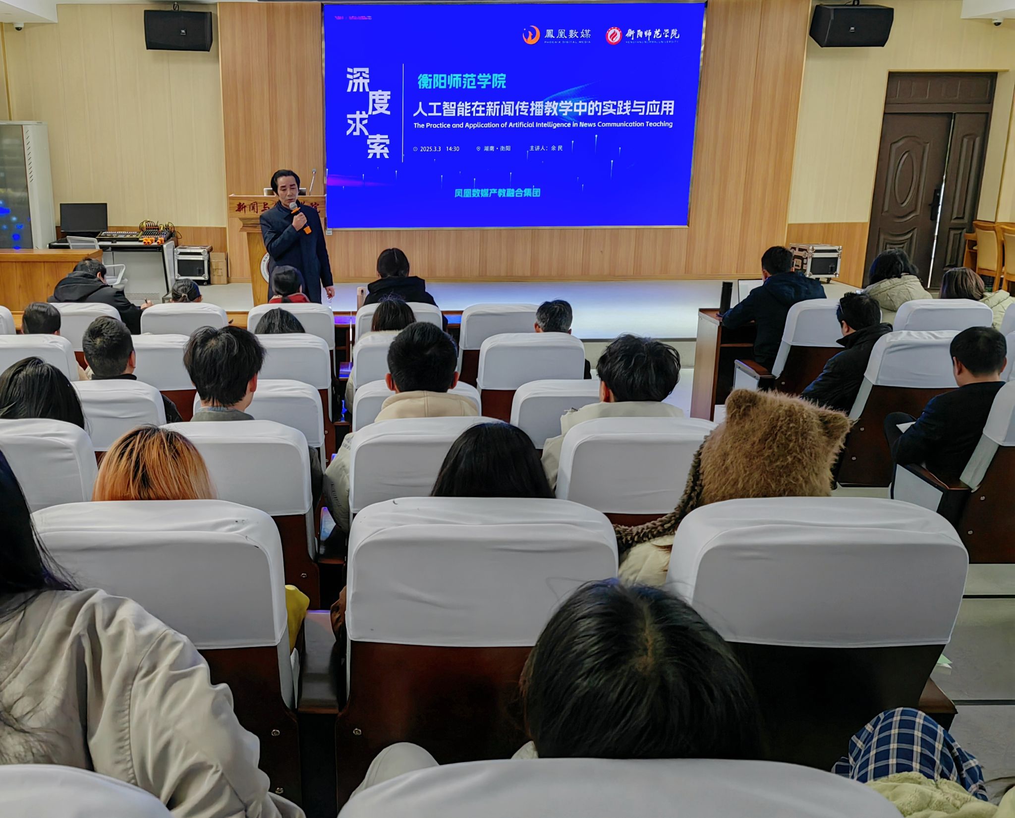 2025年3月3日下午,凤凰数媒产教集团资深项目负责人余民应邀在文A107举办了一场主题为“人工智能在新闻传播教学中的实践与应用”的专题讲座,yl7703永利全体教师和2022级部分员工到场倾听。