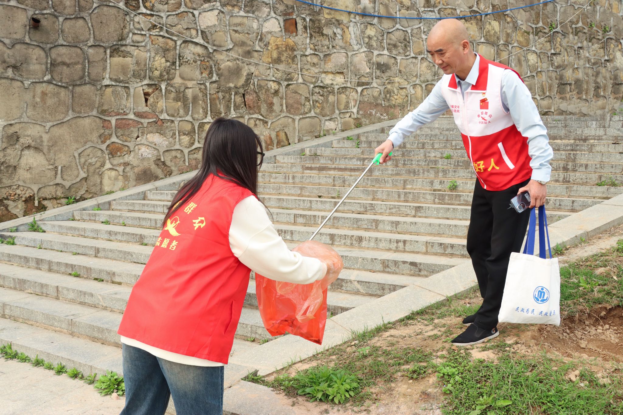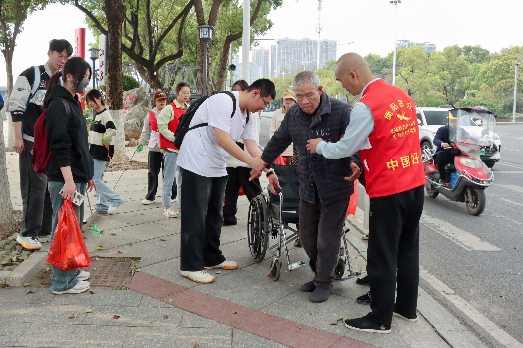 在活动进行期间,还出现了一个格外暖心的场景。志愿者们在沿江风光带附近的路口,注意到一位坐在轮椅上的老人,似乎是想要过马路却有些犹豫,志愿者们毫不犹豫地走上前去,小心翼翼地搀扶着老人帮助他过马路。这一小小的举动,虽然不在此次巡河净滩的既定任务里,却生动诠释了志愿者精神中关爱他人、乐于助人的内核,也让春日的湘江畔更添一份温暖。