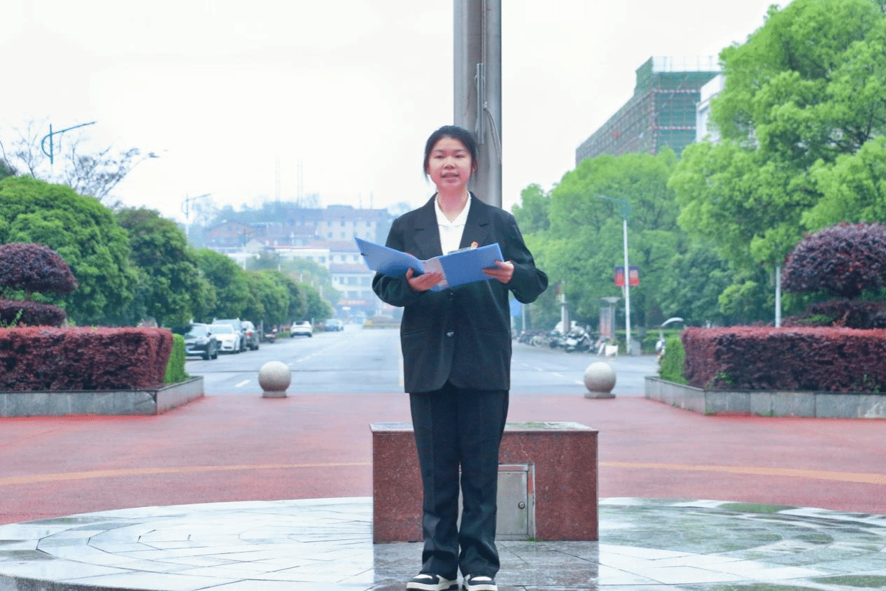 五星红旗下,2024级新闻学二班的宾慧同学作为代表在红旗下发表以“在热爱与担当中绽放光芒”为主题的演讲。