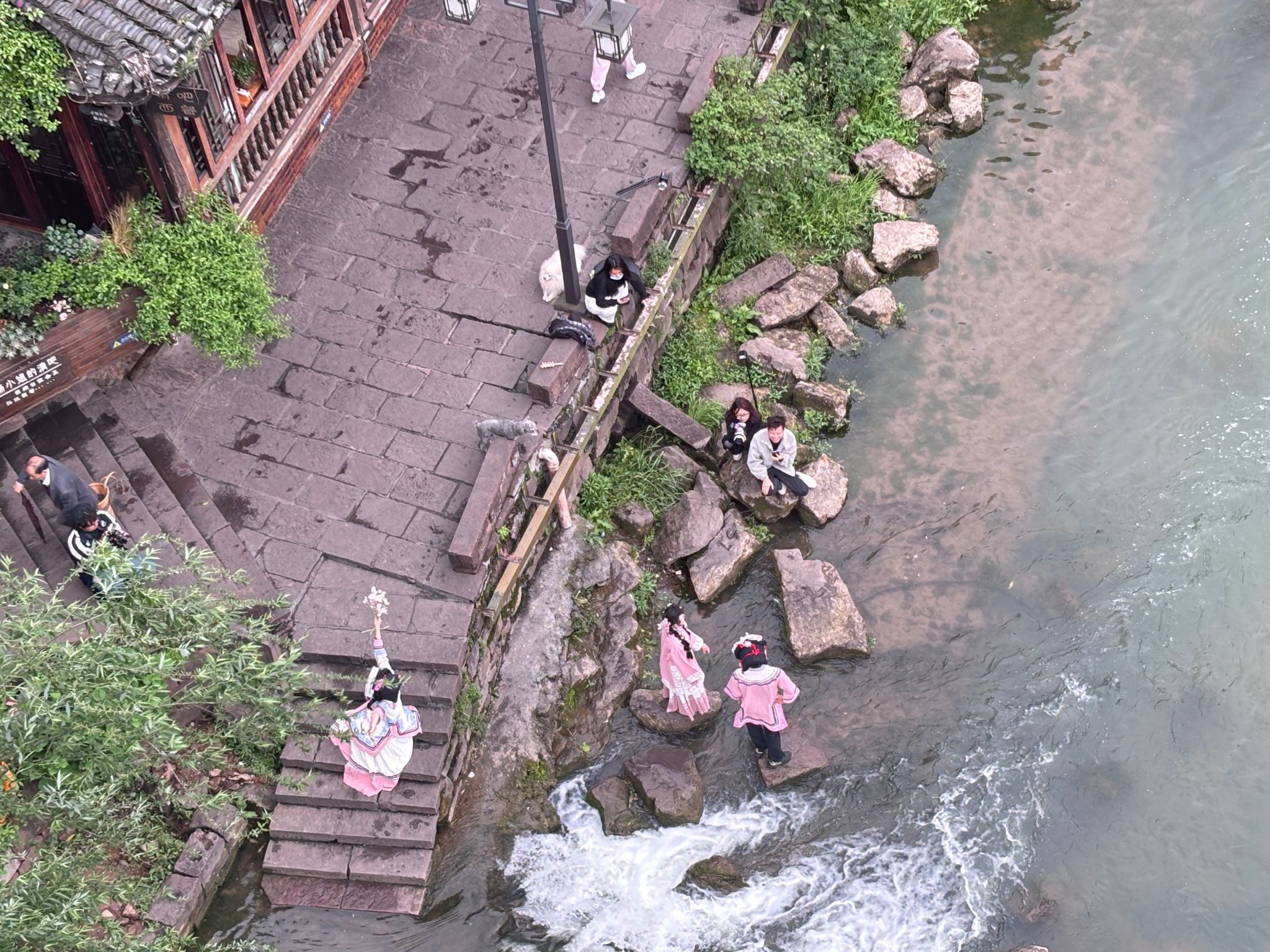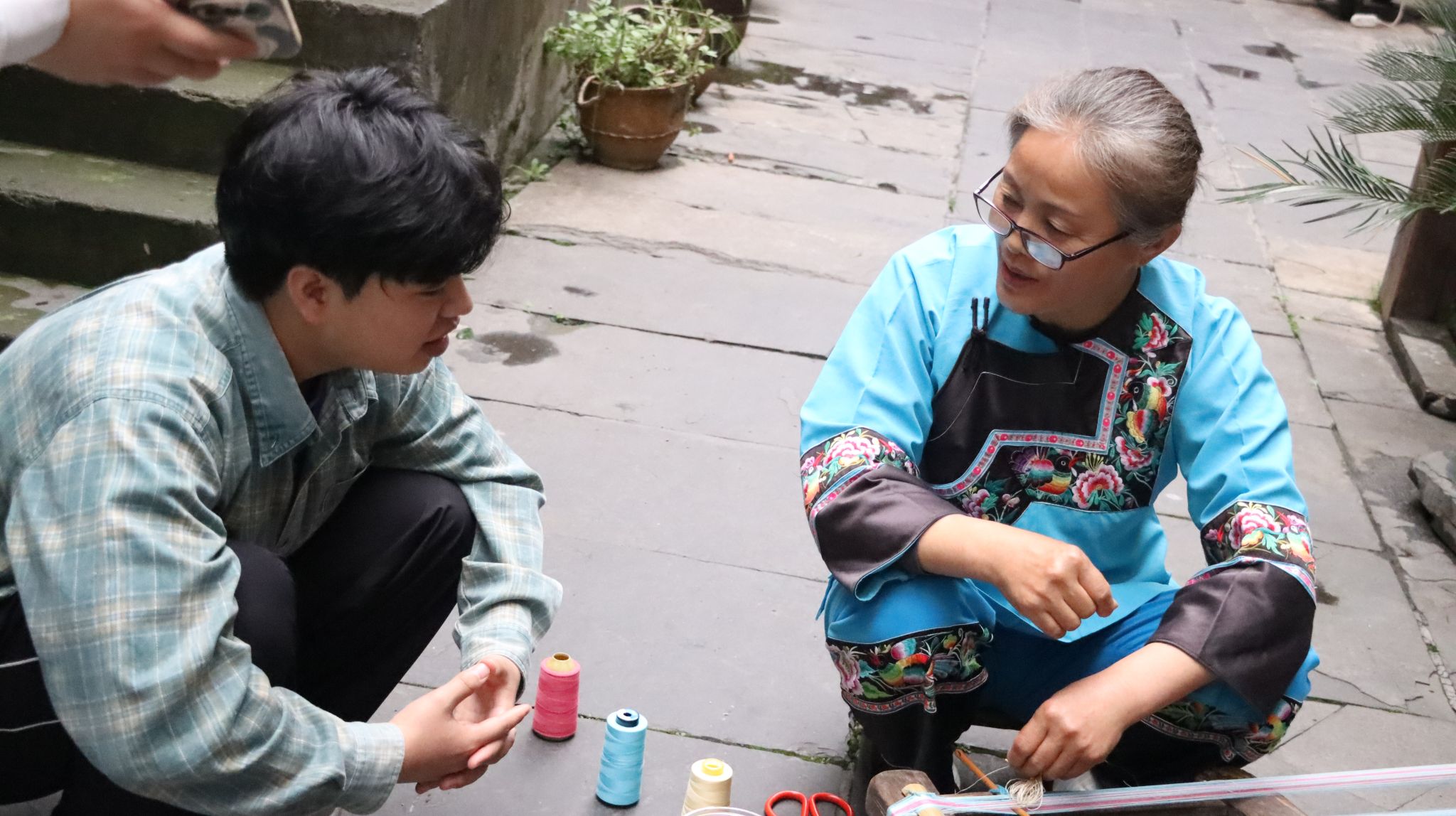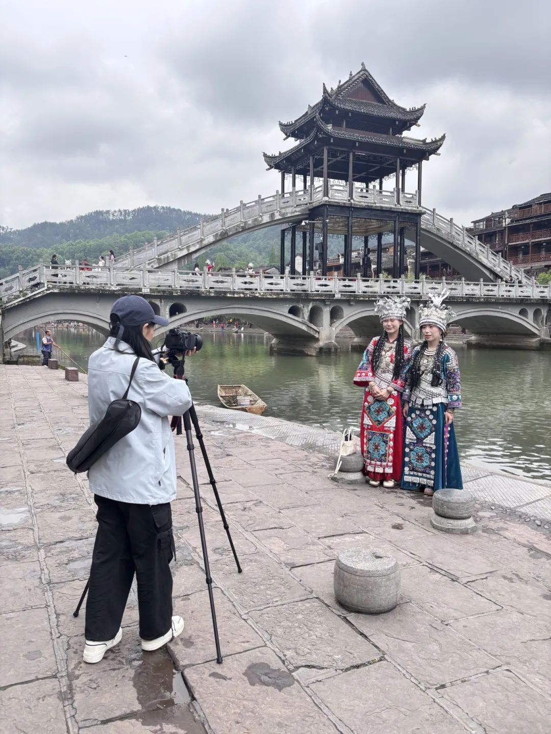 我们组在沱江边采访了两位穿着苗族传统服饰的小姐姐。 从小姐姐们的口中我们了解到她们来自武汉,最先是从沈从文先生笔下了解到了湘西的魅力,于是通过亲身穿着苗族服饰体验服饰背后蕴藏的民族故事。