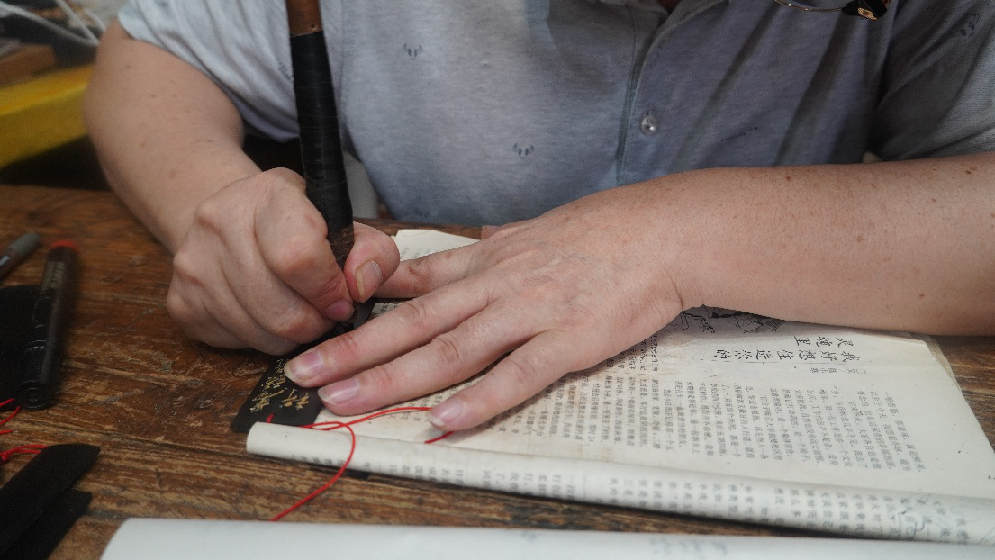 我们踏着晨露走向西递,远山与村落浸在淡蓝色的雾霭中,我们穿过窄巷,寻到那位刻字的老先生。他坐在木凳上,将岁月与故事一刀一刀刻进木纹里。他娓娓道来刻字的源流与变迁,也分享天南地北的旅人留下的言语与目光。那些已完成的刻字作品静静陈列,像时间的信物。随后,我们静静看他现场运刀,木屑轻扬,一笔一画渐次浮现。