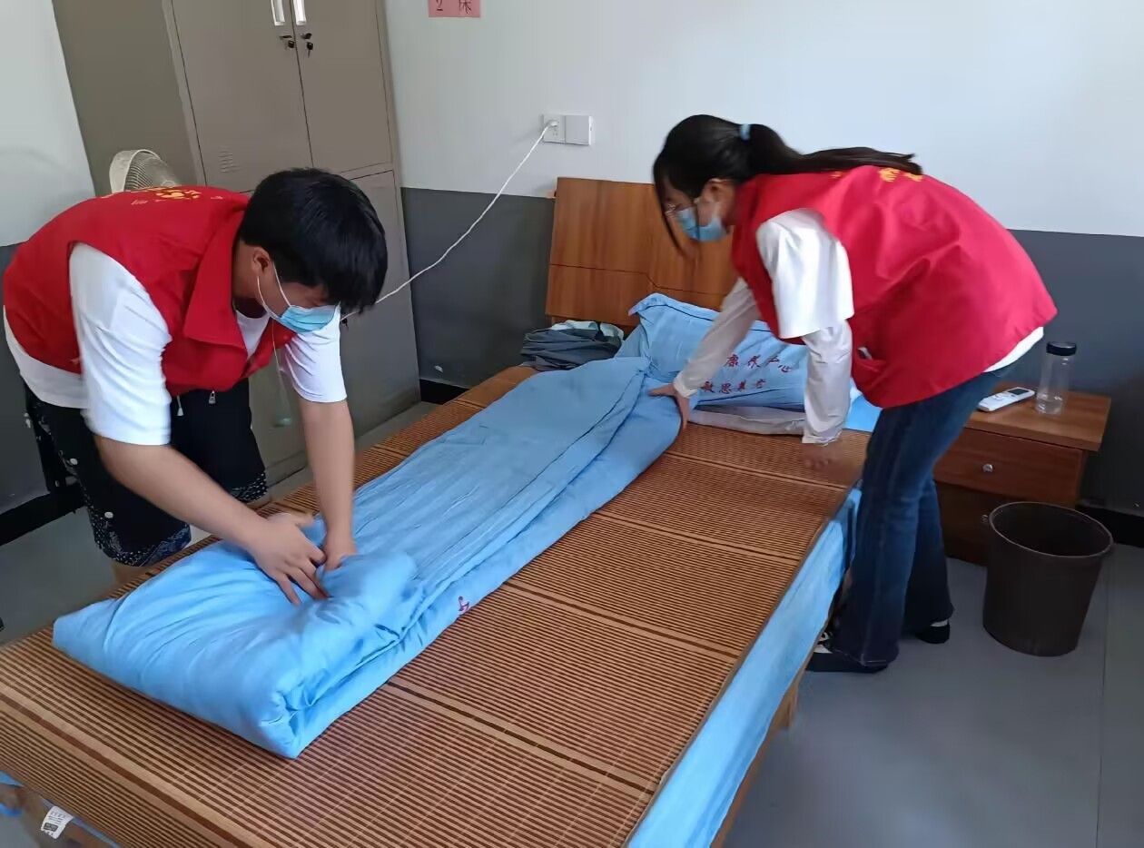 为老人整理家务,叠被子、扫地、擦窗户,每一步都井井有条,每一个动作都充满干劲。汗水带来了整洁,老人的笑脸就是不竭的动力。