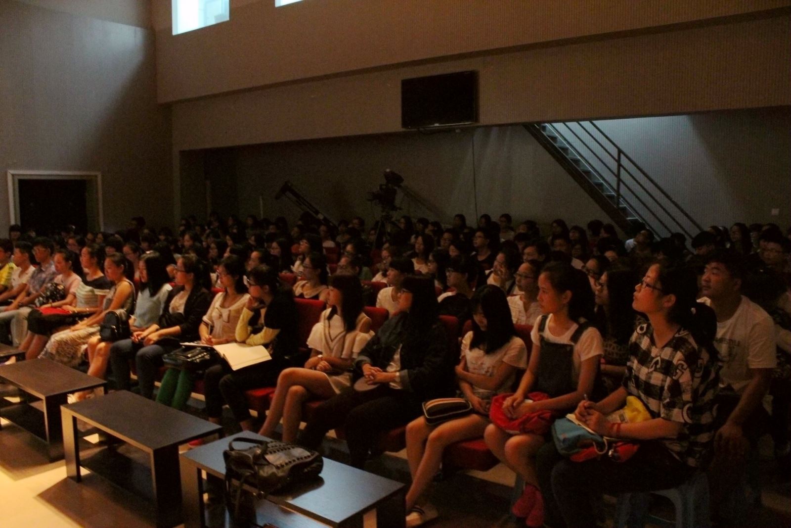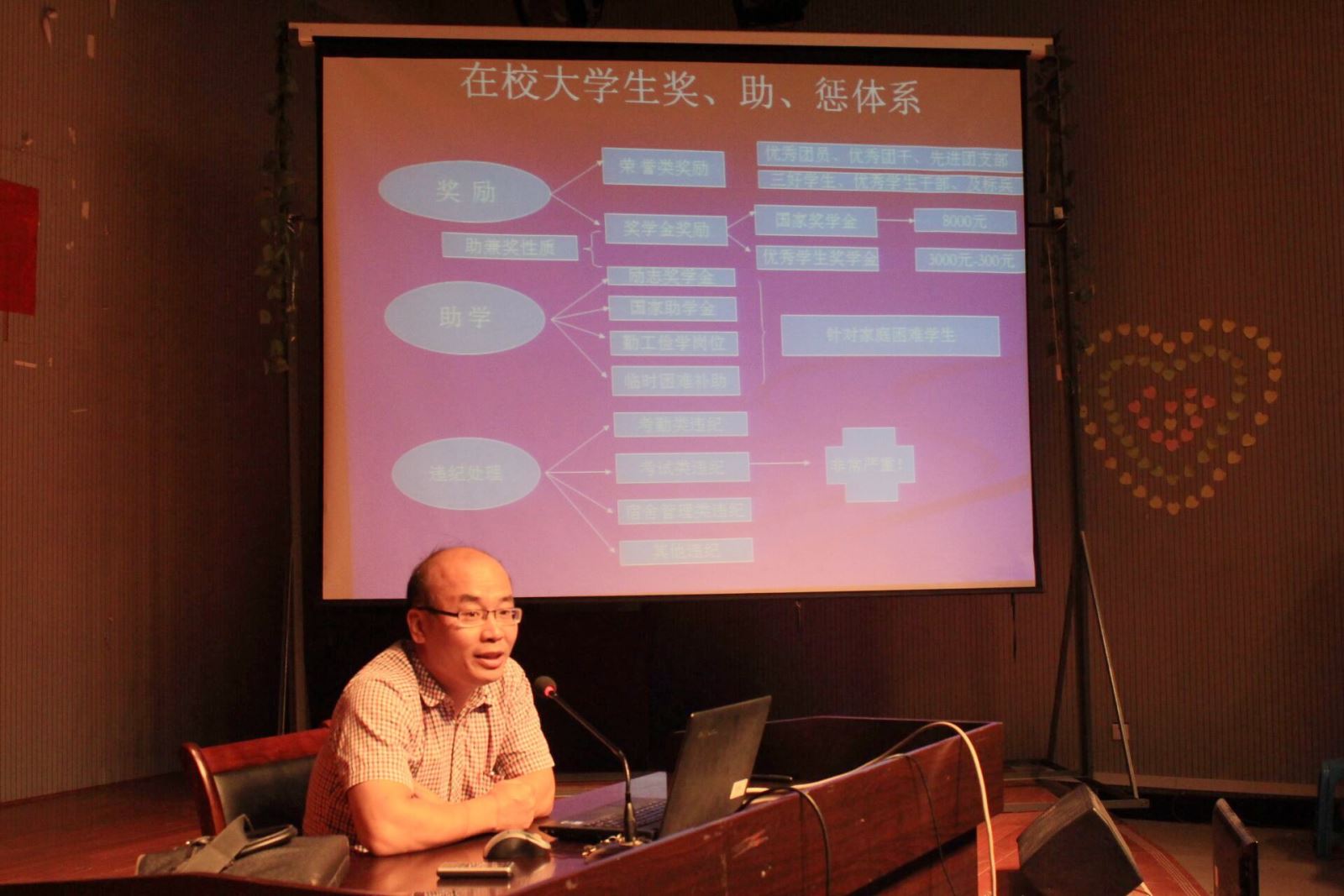 第二场座谈会的现场不时传来阵阵欢笑声。邓玉久书记展示的充满网络特色的PPT和朴实又个性化的语言赢得了同学们的热烈反响。邓书记首先跟大家分享了自己的大学记忆,希望大家能珍惜大学的四年时光。接着,邓书记在思想道德及个人修养等方面结合自身的经历告诫新生们要在大学四年里好好充实自己,学会做人,怀揣着一颗感恩的心去对自己的父母和身边的老师同学,将来争取成为一名栋梁之才。