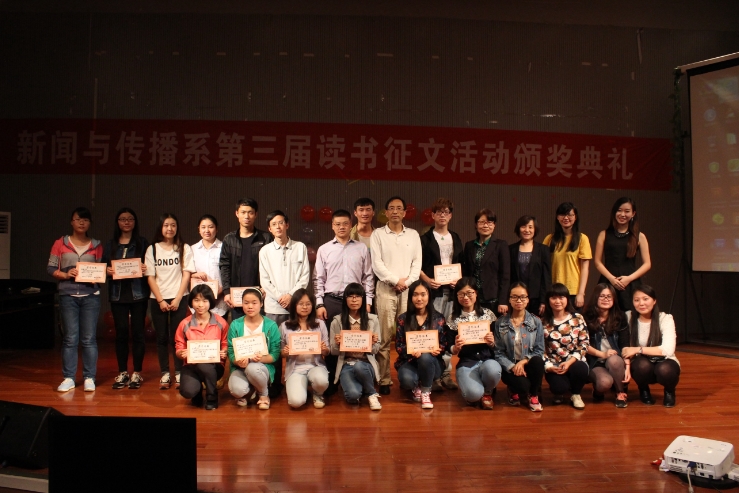 本届读书征文活动共收到498份征文,经过评选27篇文章获奖。其中,12级广电班谢芬的《看此“花”时——读龙应台〈目送〉有感》、13级新闻一班王超的《温暖的怀念》、12级新闻一班俞强年的《走进胡适》荣获一等奖。此外,13级新闻一班还荣获优秀组织奖。